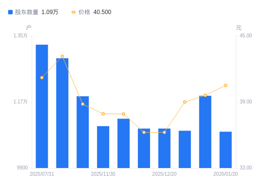 日期A股户数(户)流通A股户均持股数(股)户均持股市值(万元)2026-01-20108884358.9517.652026-01-09118703998.3415.832025-12-31109174347.3716.952025-12-20109764324.0015.672025-12-19109764324.0015.672025-12-10112434221.3216.002025-11-30110414298.5516.302025-09-30118564003.0615.542025-08-10128923681.3715.892025-07-31132623578.6714.75