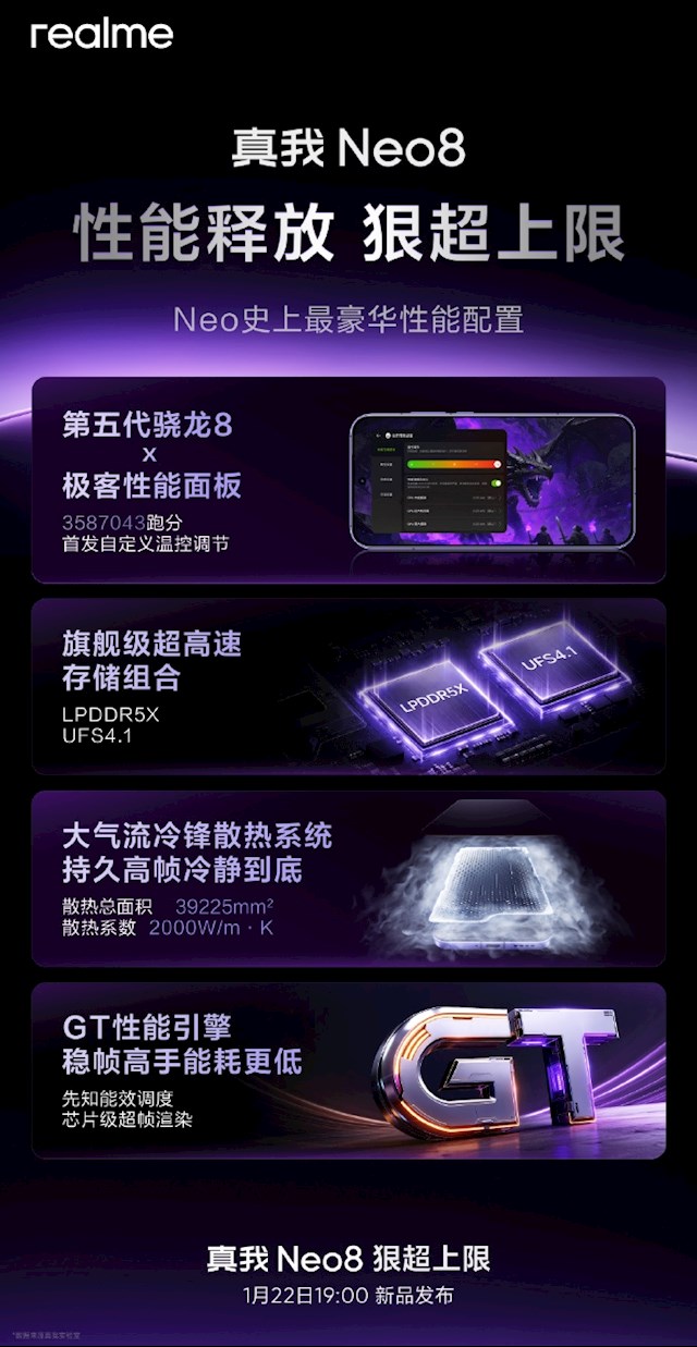 为保障高负载下的稳定输出,真我Neo8采用大气流冷锋散热系统,总散热面积达39225mm²,散热材料导热系数高达2000W/m·K。